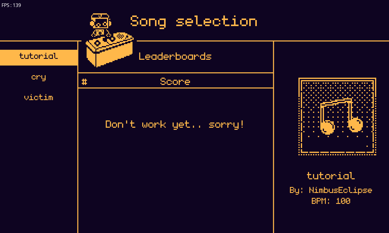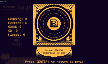 Sobre o gameplay, senti que a sincronia não está 100% ou talvez eu seja ruim. Mas não senti que conseguiria jogar de olhos fechados, o que acho essencial para um jogo de ritmo. No geral, parabéns pelo projeto!